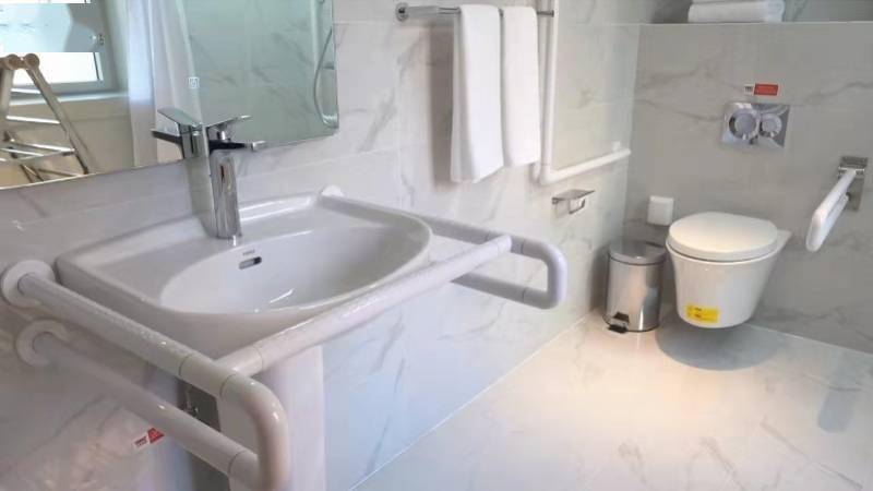 在房间里的无障碍卫生间,李彬介绍,卫生间的门是推拉式的,且宽度允许轮椅自由出入;盥洗池、马桶、洗浴水龙头旁边都设有扶手。